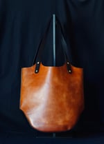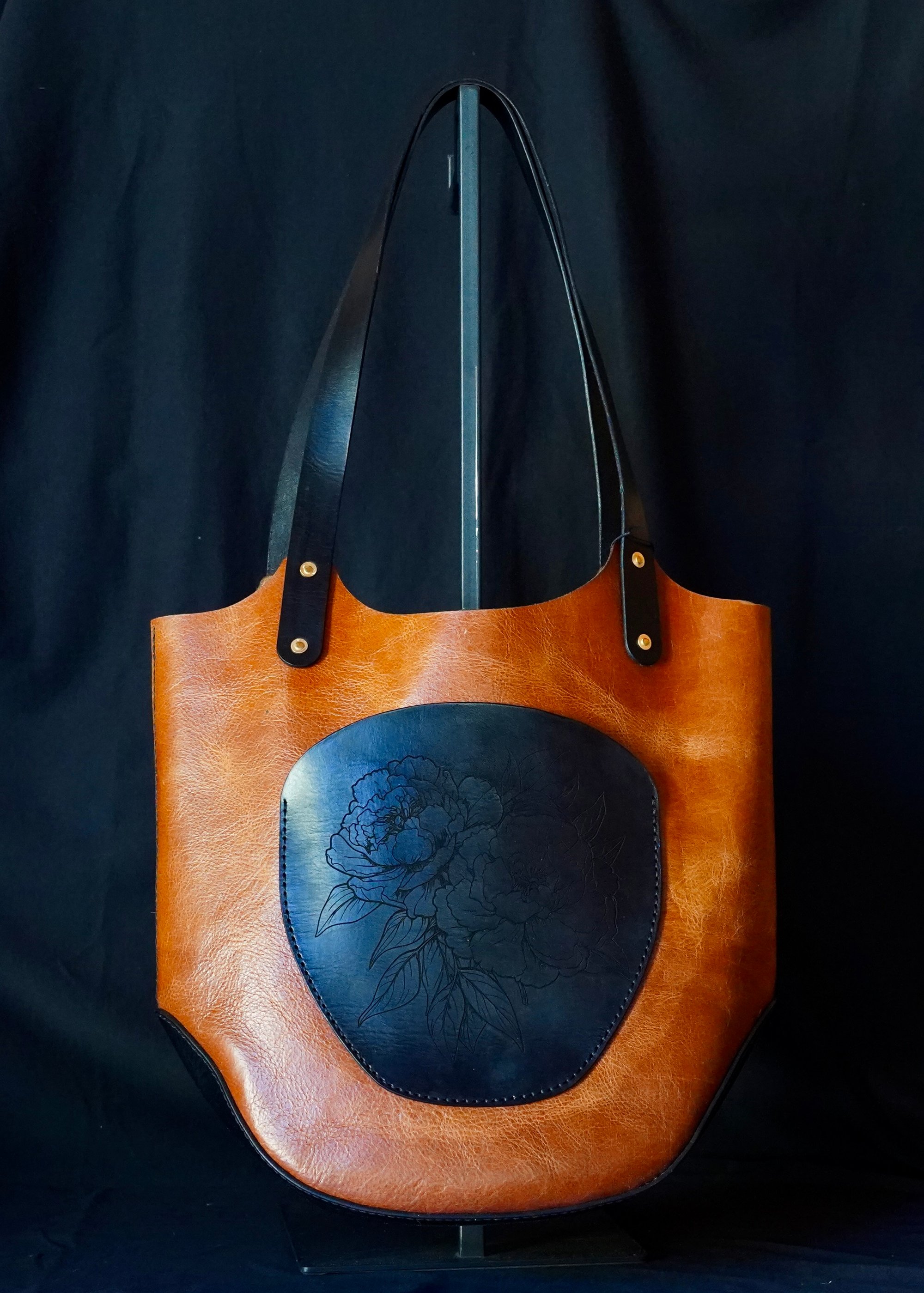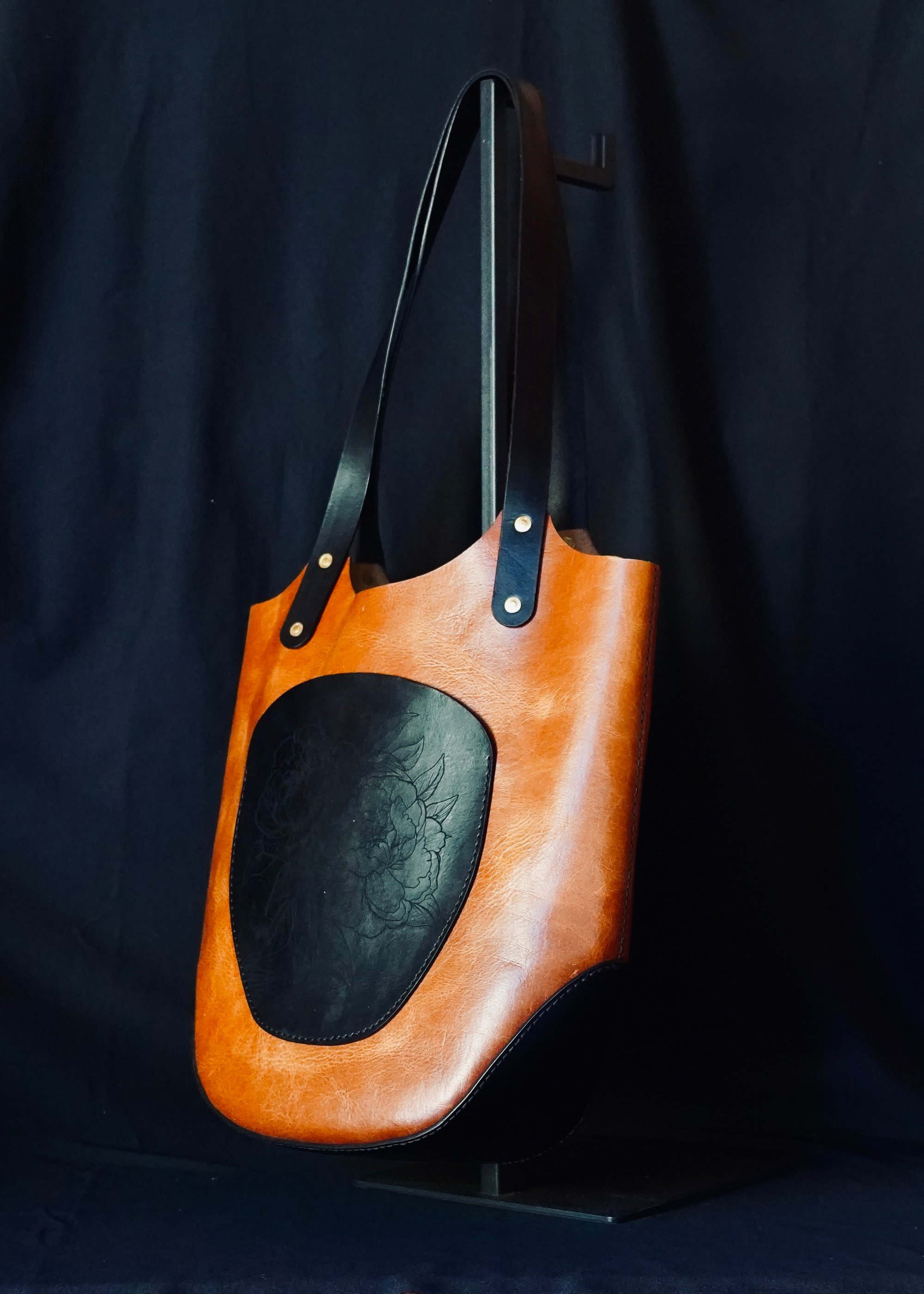 Gorgeous, supple, brown water buffalo leather accented with black cow hide, hand dyed & laser etched. Hand stitched -using a double thread saddle stitch for strength & durability. Brass rivets fasten the handles for a timeless, handcrafted touch. This bag is both casual and classy. Perfect for day-to-day or a night out.