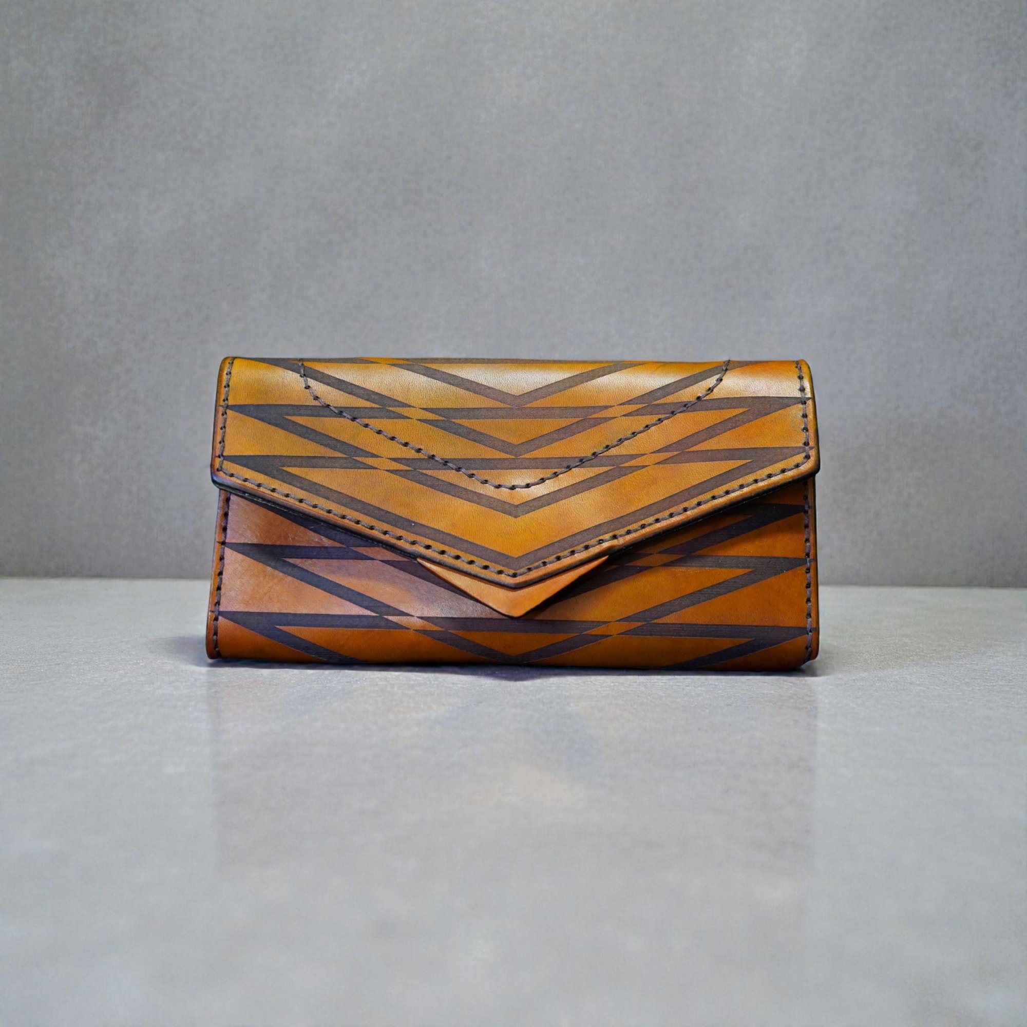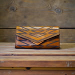 This hand-sewn, hand-dyed, etched clutch is light weight enough to be a wallet, but fits enough essentials to be a clutch. The interior has 6 card slots, a zipper pouch and 3 pocket compartments. It can comfortably hold a cell phone and/or a pair of glasses.