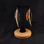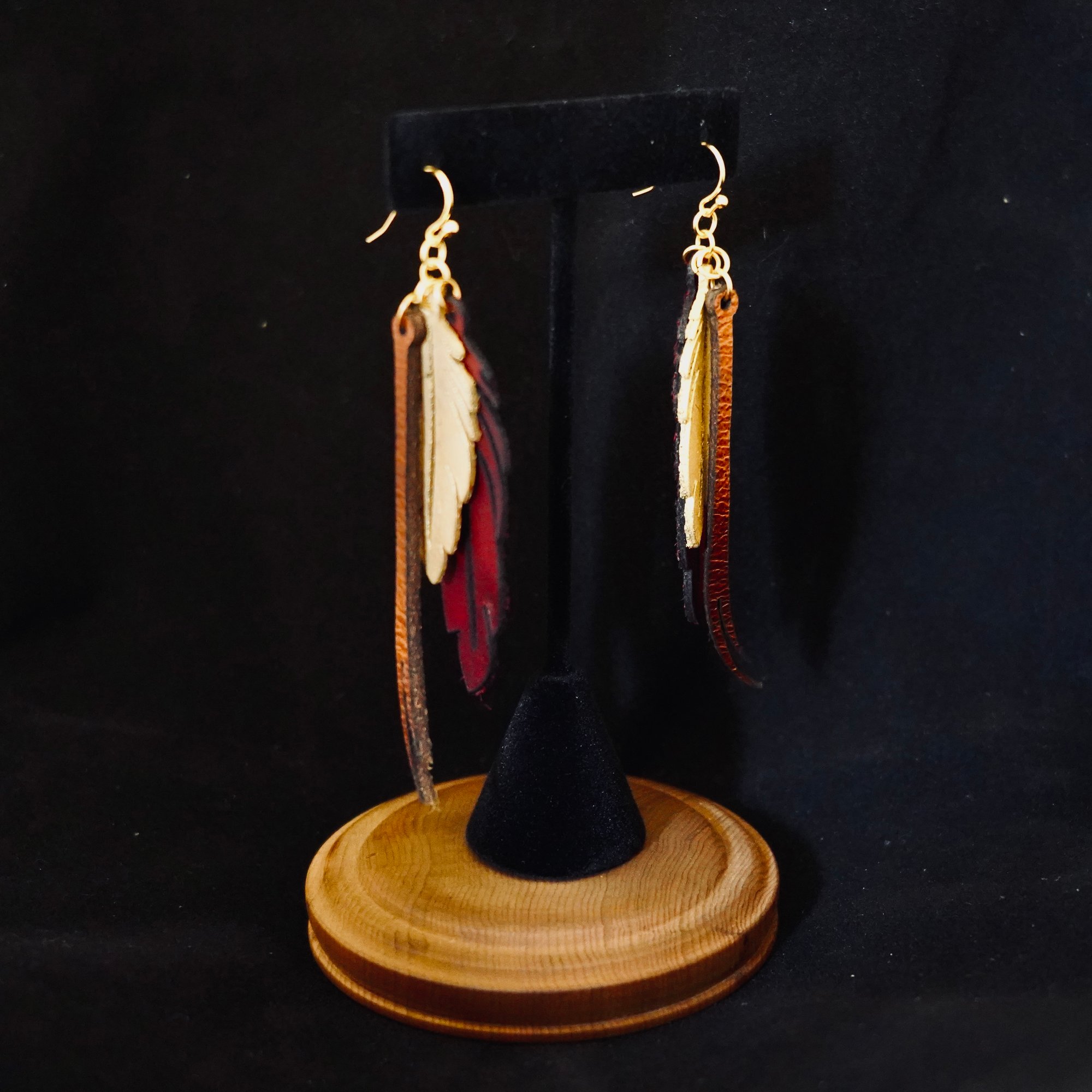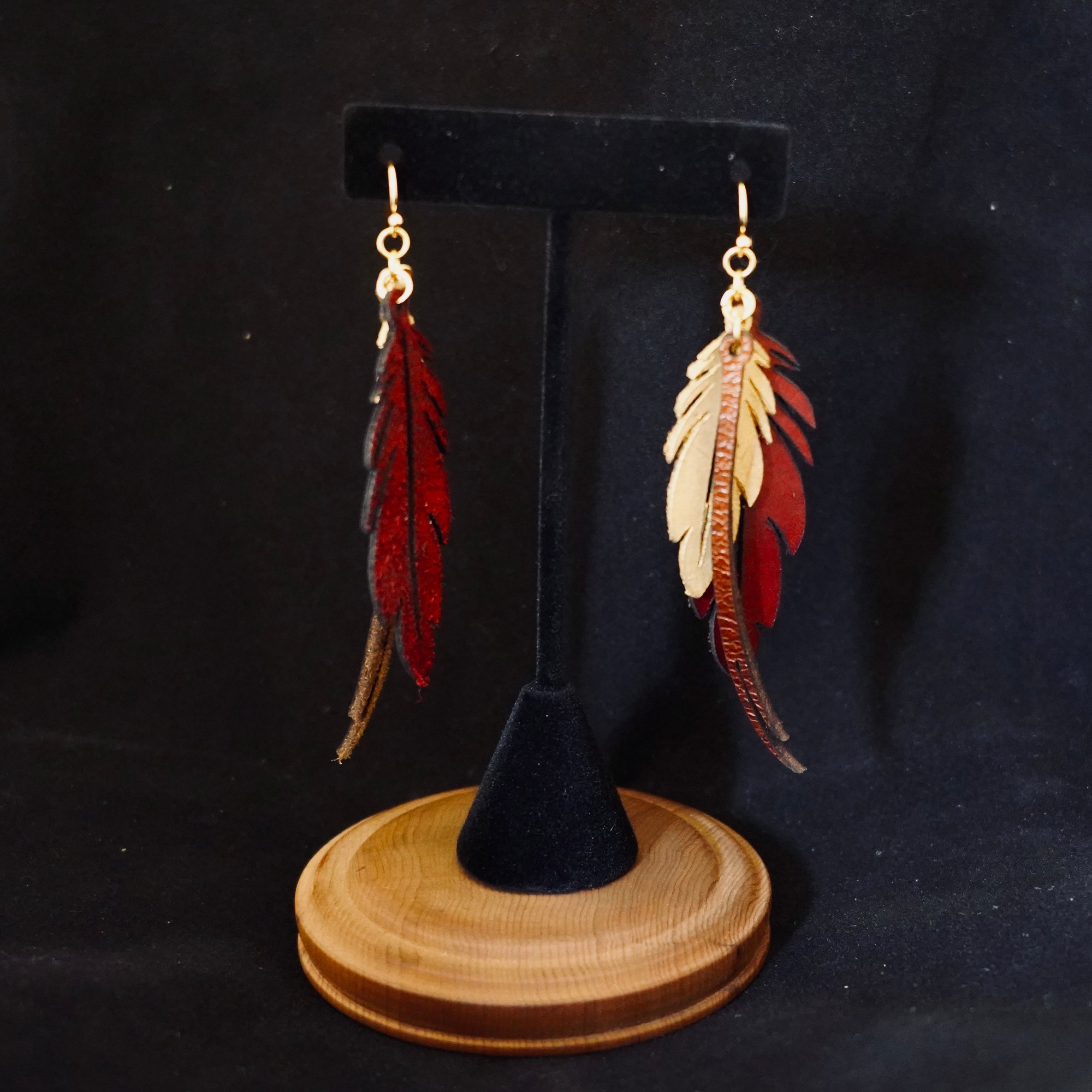 Beautiful red feather earrings with gold smaller feather "friend" and a tan accent "flash"